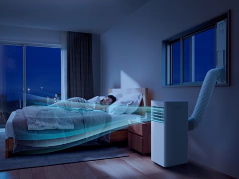 冷やし過ぎや過剰な運転を制御するインバーターを搭載したポータブルクーラー。インバーターにより、冷風運転中にボタンひとつで運転音を45dB未満に抑える低騒音運転へと切り替えられ、音が気になる就寝時にも対応するという。