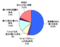 また、女性が好感を持つ体毛のイメージでは「清涼感がある整った体毛」が52.8%、「体毛がほとんどない状態」が18.6%、「薄くて長さの整った体毛」が15.6%となっている。
