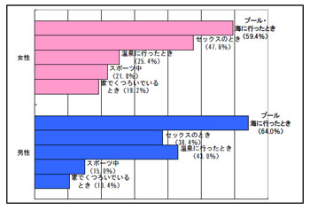 女性が男性の体毛を気にするシチュエーションについては、「プール・海」が59.4%ともっとも多く、次いで「セックスの時(47.6%)」、「温泉に行ったとき(25.4%)」という順位になった。男性が自分自身の体毛を気にするシチュエーションについても、同じく「プール・海」が64%と最も高く、同社では「これからの時期、ますます意識が高まる」としている。なお、2位は「温泉に行ったとき(43%)」となっている。