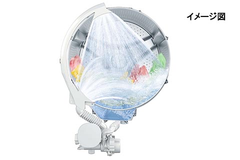 それを実現したのが、水を循環させるシャワーを上下の2段に設けた「ナイアガラ循環2段シャワー」。従来シャワーは上段にしかなかったため、ある程度の水量がないと循環水を持ち上げられませんでしたが、今回下段にも備えたことで、少量の水でも洗剤液を浸透させられるようになりました。その後に上段シャワーからも水を足して大流量で洗剤液を循環させて洗うという二段構えによって、泥汚れや、奥に隠れた汚れにもアプローチします。最初に少量の水で洗っている時は、洗剤がより高濃度な状態です。高濃度洗剤を繊維の奥までしっかり浸透させることで皮脂汚れまでスッキリ落とせます。