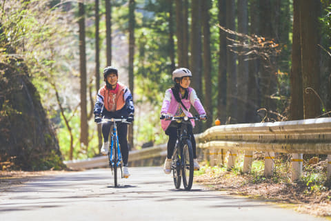 そんなとき、絹代さんが状況を一変させる1台を発見しました。パナソニックの子供用e-bikeの「XEALT SJF」。子供の体格に合うように設計され、しかし、そのパワーは大人用のe-bikeにもまったくひけをとりません。「これなら一緒に楽しめるのでは?」と考えた絹代さん。長女とともに2人、春らしい陽気に包まれた奥多摩へと向かい、念願の母娘サイクリングの実現を果たしました。