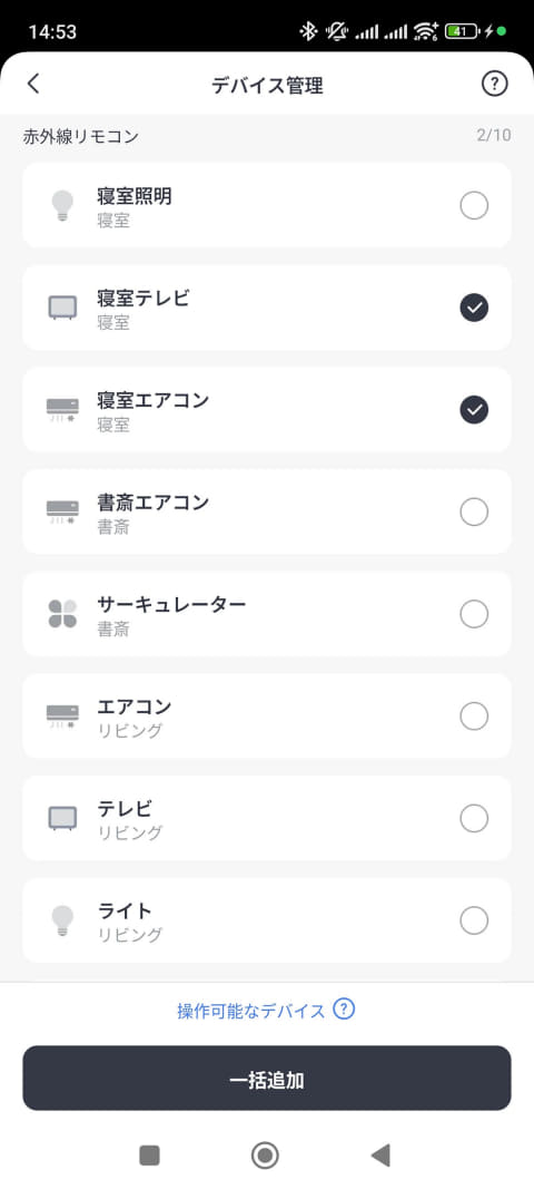 無事に赤外線リモコンの登録が完了したら、続いて「デバイス&シーン管理」で登録した機器をSwitchBot ハブ3に登録します。登録した機器をすべてSwitchBot ハブ3の画面で操作できるのではなく、その中から画面で操作したい機器だけを厳選して転送するイメージです。