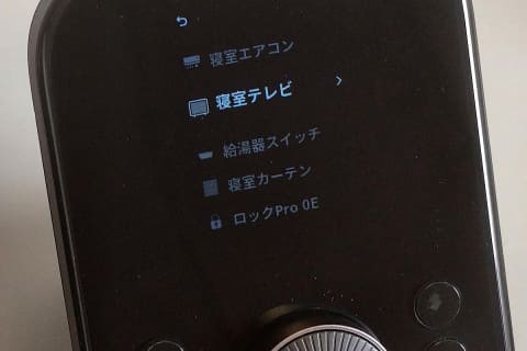 実際にSwitchBot ハブ3から操作してみましょう。操作はDial Masterの右上にあるメニューボタンから始めます。メニューボタンを押すと、「デバイス&シーン管理」で登録した機器が一覧表示されます。十字ボタンもしくはダイヤルを回して選択し、中央のOKボタンを押します。