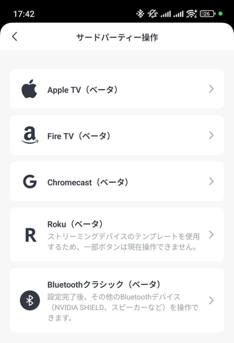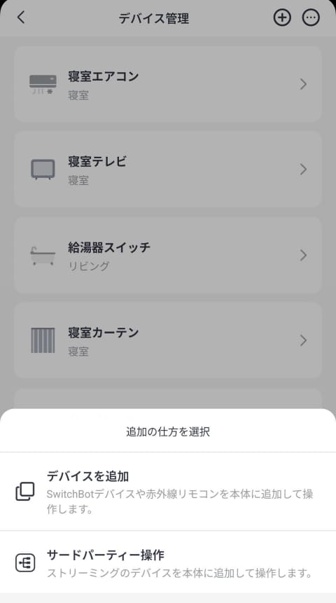 SwitchBotアプリのSwitchBot ハブ3のホーム画面から「デバイス&シーン管理」を選び、「デバイス管理」の画面を開いてから「+」ボタンを押し、「サードパーティー操作」を選び、ペアリングを行ないます。