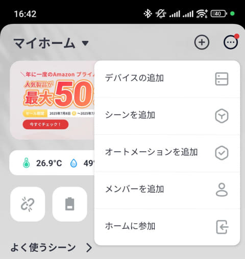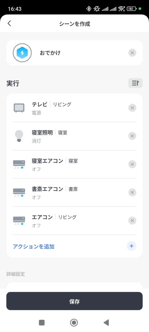 SwitchBotアプリでは、複数の機器の操作を「シーン」として登録することもできます。例えば「おでかけ」というシーンにテレビとエアコン、照明をオフにする機能を割り当てるといった感じです。シーンはSwitchBotアプリのホーム画面から追加できるようになっているので、その方法を紹介しましょう。
