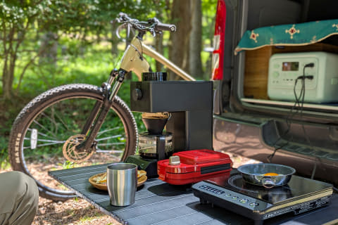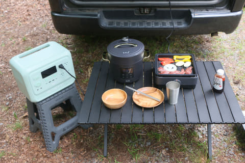 荷室にベッドを展開し、車中泊モードにしたら、夕食の準備を始めます。持ってきたのは、普段は自宅で使っている電気圧力鍋とホットプレート。どれくらい家電製品を動かせるかのテストでもあるので、特にアウトドア向けの製品は使いませんでした。
