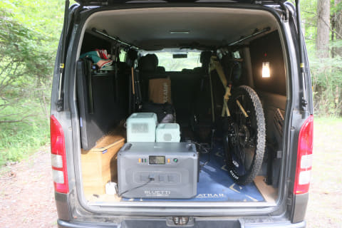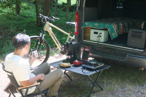 目的地(親戚の山荘の駐車場)に到着し、車中泊の準備をします。結構な山の中なので、現地でのライドを楽しむためにマウンテンバイク(MTB)タイプのe-bikeも持って行きました。充電がなくなってもポータブル電源から充電できるので、残量を気にせず走り回ることができます。