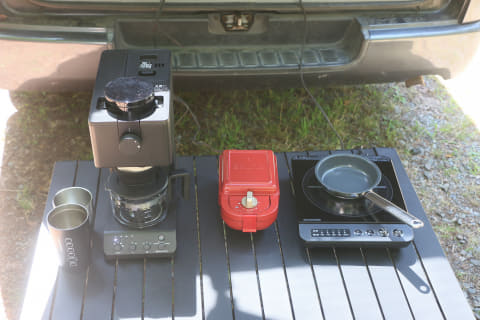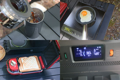 翌朝、目覚めたら周辺を軽く散歩して、朝食の準備に取りかかります。使用したのは、やはり普段は自宅で使っているIHクッカーとホットサンドメーカー、そしてコーヒーメーカーという普通の家電製品。どれも、それなりに電力を消費しますが、昨日の経験からそれくらいは平気で動かせることがわかっているので安心です。