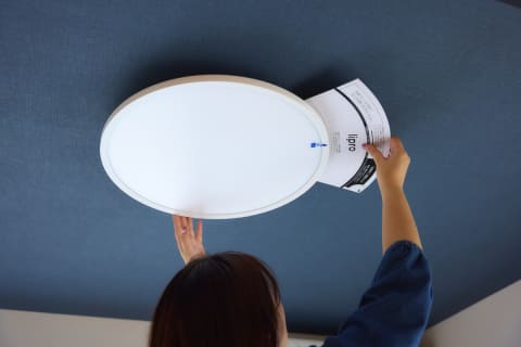 一般的なLEDの現状がわかったところで、liproを試してみましょう。今回試用したliproの明るさは4,000lm、適用畳数は8畳までということで、わが家の寝室にちょうどいいサイズ。本体サイズは500×33.5mm(直径×高さ)で、照明部分の厚さは17mmとかなり薄型です。