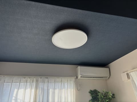 実際に取り付けたところ、薄くてスタイリッシュなデザインのため、天井と一体化しているようにも見えます。シーリングライトはデザインで遊べず少々味気ないという印象でしたが、これはおしゃれで気に入りました。