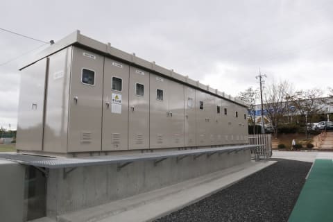 太陽光パネルは、写真には写っていないが施設の奥に設置されており、6,600Vへの昇圧は施設左側の建屋内にあるキュービクル(変電施設)で行なわれている。