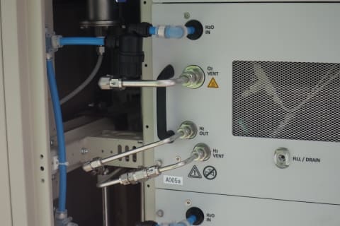 なお、発電に必要な水素は、専用の水素タンクに貯蔵して必要に応じてタンクから燃料電池に供給されるようになっている。また工場への電力供給は、電圧の高い6,600Vなので、キュービクルという変電設備を介して高圧(三相=事業用に使われる電源、一般家庭は三相電源から単相に変換)に対応している。
