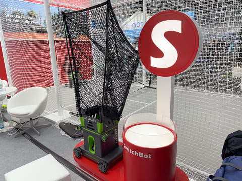 SwitchBotのブース正面には、同社の新しいブランド「ACEMATE(エースメイト)」から登場する“テニスロボット”が実演を行なっていて、多くの人が集まっていました。