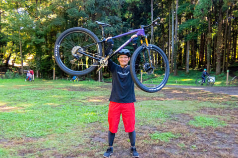 そして、車体は驚くほど軽い。下の写真にあるとおり軽々と持ち上げられます。フレーム、前後リム、ハンドルバー、シートポストとあらゆる部分がカーボン製ということもあるのだと思いますが、もちろん新型XTRの軽量設計も活きているのでしょう。