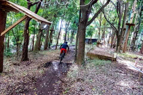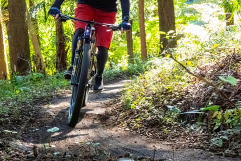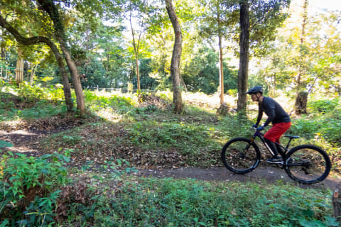 そんなわけで、さっそくコースイン。スタートから中盤まで続く上りをやすやすと駆け上がっていけます。以前このコースを走ったときは、トレイルアドベンチャー・よこはまのレンタルMTBも試させてもらったのですが、1本走ったら完全に息が上がり、合間に長く休憩を取らないと走る気力が湧かないほどでした。