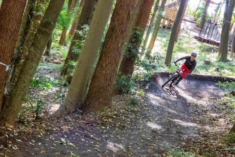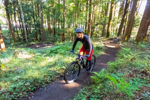 とはいえ、現時点で販売されているのは通常のMTB向けモデル(ディレイラーの型番はRD-M9250)で、これを含む新型XTRのコンポーネンツをフル装備した市販MTBはメリダとキャノンデールのみ。メリダのBIG.NINE 10Kは、お値段も冒頭に書いたとおり約150万円と目ん玉が飛び出そうですが、せっかくお借りできるならちゃんとしたコースで走ってみよう、ということで、都心のほど近くにある「トレイルアドベンチャー・よこはま」にお邪魔しました。