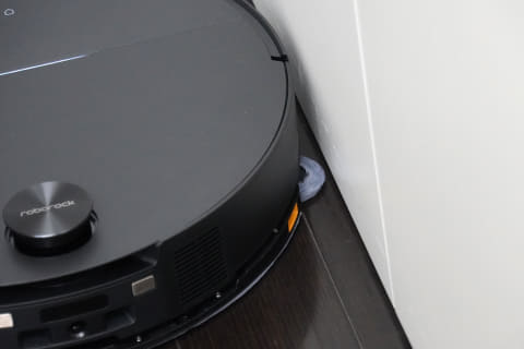 ロボット掃除機だけに、まず気になるのが掃除力。Saros 10は吸引と水拭きの両方を同時に行なえるモデルですが、吸引掃除ではロボロック史上最高となる22,000Paの超強力な吸引力を備えています。実際に掃除後の床を確認すると、ロボット掃除機では取り切れないことも多いフローリングの溝に落ちた細かな土まで、しっかり吸い上げられていました。また、従来は苦手とされてきた部屋の隅でも、サイドブラシがしっかり伸びてゴミをかき出すので「角にホコリが残りがち」というロボット掃除機ならではの弱点もカバーしています。