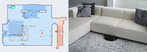 筆者がロボット掃除機を利用している環境には大きなL字ソファがあるのですが、このソファ下の隙間がちょうど8cm。このため、いままで試した多くのロボット掃除機はソファ下には入れませんでした。しかしSaros 10は昇降式LDSのおかげでこの条件をクリアし、長年掃除の死角になっていたソファ下までしっかり走行してくれました。