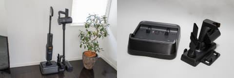 こうしたときに便利なのが水拭き掃除機。高速回転ローラーで床をこすり洗いするため、手作業の雑巾がけより汚れ落ちが良く、腰をかがめずに楽な姿勢で掃除可能。一方、吸引機構やローラーブラシを搭載するぶん、本体やヘッドが大きく重くなりがち。それに比例して充電ドックも大型化しやすいのが難点でした。ここに普段使いの(吸引用)掃除機まで加わると、2台の掃除機と2つのドックが必要になり、限られた住宅スペースを圧迫してしまいます。