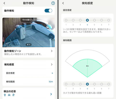 距離は2~12メートルの7段階で切り替えられ、近くに人がいるときだけ通知・録画する、というのもできるし、少し離れたところを通過するクルマや動物がいれば通知・録画する、というのも可能。これの何がいいかというと、たとえば自宅の敷地内でのみ検知したい場合に、より正確に、ユーザーの望むタイミングで通知・録画できることだ。