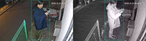 屋外カメラは、撮影範囲内の動きを検知する「動作検知」と、AI(人工知能)によって人物の形を判定する「人検知」の2つの検知機能を搭載しています。