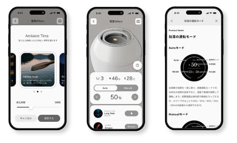 さらに、新Rainでは、旧モデルより大型化した円形ディスプレイを活かした新機能「Ambient Time(アンビエントタイム)」も搭載されました。これは、液晶画面に映し出される映像と、新モデルで追加された間接照明のような柔らかな光、そして静かに流れるサウンド連動して、加湿と共にリラックス体験をお届けするモード。雨音に合わせて画面上に小さな雨粒が落ち、そこから次々と波紋が広がっていく様子を映し出したり、せせらぎや虫の音とともに水面がゆるやかに揺れる映像が流れたりと、生活の邪魔をすることなく水の気配を感じさせる3種類のテーマが用意されています。