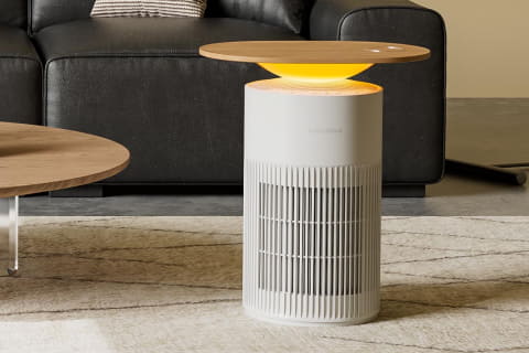 上部のテーブルにはスマホを置くだけで充電できるワイヤレス機能※があり、間接照明にもなるライト付き。空気質を4色で表示するためパッと見で状況がわかるほか、全10色のライトで好みに合わせて明るさや色を調節できる。1台あるだけで様々な役に立ち、限られた部屋のスペースを有効に使えるのが魅力だ。
