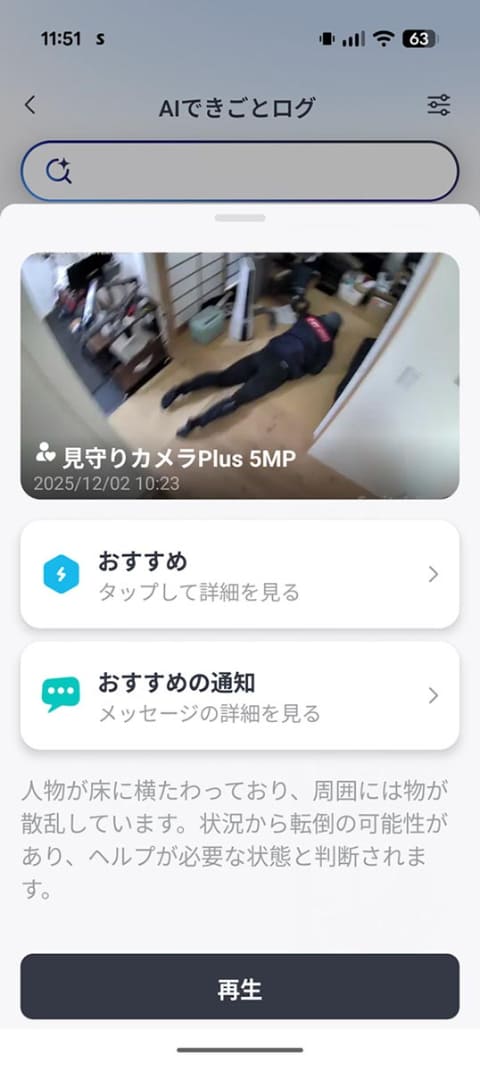 もしくは室内に設置したカメラだと、「人物が床に横たわっており、周囲には物が散乱しています。状況から転倒の可能性があり、ヘルプが必要な状態と判断されます」という文章で教えてくれたりする。つまり、自宅や両親の家で誰かが倒れてしまうような緊急事態が発生した(と考えられる)とき、映像をリアルタイムで見ていなくてもすぐに気づけるというわけ。