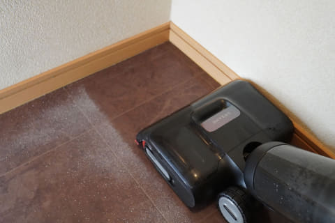 さらに感動したのが、壁際の拭き残しのなさです。一般的な水拭き掃除機は、どうしても壁際3mm~1cmくらいに汚れの取り残しが発生しがち。ですが、実際にフローリング全面に粉を撒いてテストしてみたところ、H15Sはヘッド左右の壁際もヘッド前面にある壁ギリギリにある汚れもしっかり掃除してくれます。
