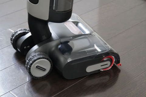 実際にH15Sを使ってみると、驚くのが細かな場所まで掃除できる小回りのよさ。家電ライターという職業上、多くの水拭き掃除機を使っている筆者ですが、水拭き掃除機は本体のボリュームから「家具の下に入らない」「壁際ギリギリまで掃除できない」といった製品が多いのです。