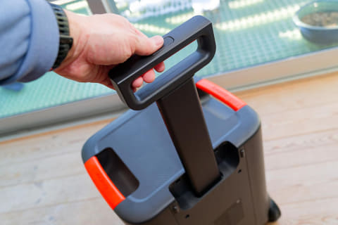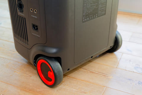 ただし、大容量なだけに本体はそれなりに大きくなっています。サイズは約385×309×491mmで、高さは大人の膝あたり。重量も約35kgあって、階段の上り下りが伴う持ち運びを気軽にする、というわけにはいきません。それでも本体にはキャスターと伸縮するハンドルを備えているので、スーツケースのようなスタイルで床を転がして移動するのは簡単です。