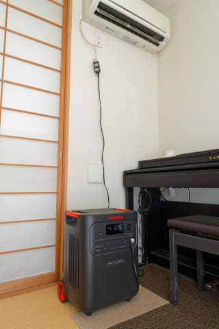 続いて試してみたのが、エアコン。筆者の住む東京を含め寒冷地ではない地域ではエアコンが冷暖房の要です。停電してしまうと特に夏場は命に関わりかねないので、Jackery ポータブル電源 3600 Plusでどれくらい動かせるのかは確かめておきたいところ。