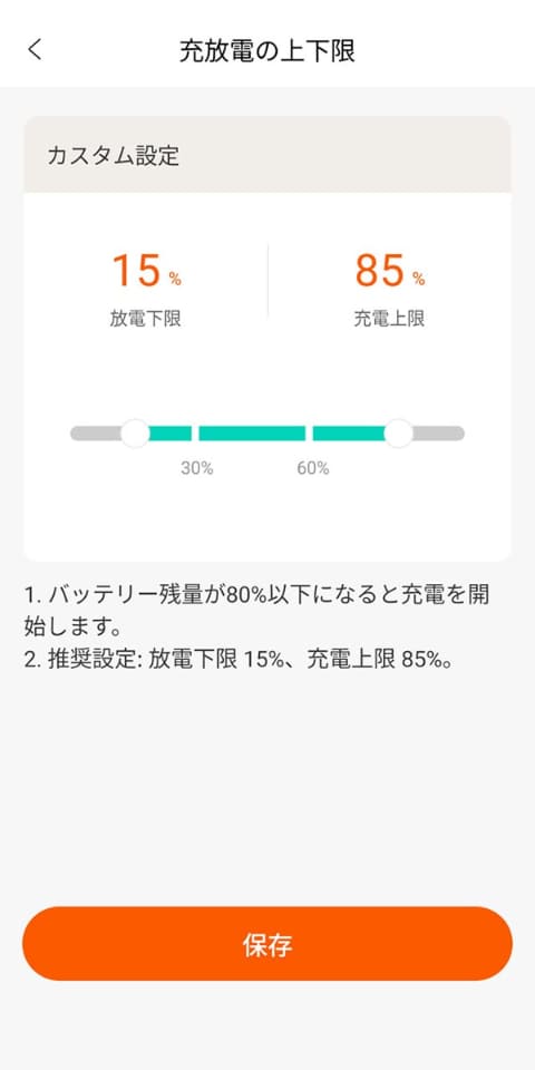 なので、ここを「完全に使用」から「カスタム設定」に切り替えます。カスタム設定にすると「放電下限」と「充電上限」を個別にスライダーで設定でき、たとえば「15%で放電ストップ、かつ85%で充電ストップ」といったような設定ができます。