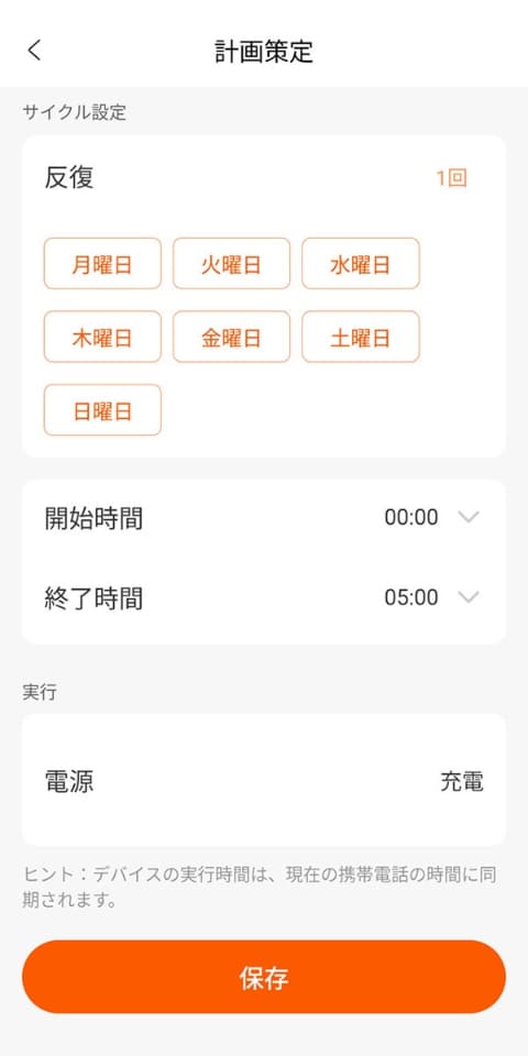 そのうえで「動作モード」で充電するスケジュールを決めます。もし夜間の電気代がおトクなプランを電力会社と契約しているなら、夜中にポータブル電源を充電するように設定すれば、充電は安価な夜間電力でまかない、日中は充電せずポータブル電源の電力だけで過ごす、ということも可能になります。