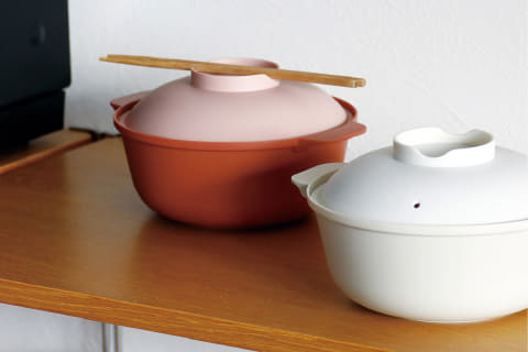 麺類だけでなく、ちょっとした鍋を作るのにもおすすめ。蓋に箸置きスペースが付いているのも便利。直径は20cm程度で、満水容量は1.6L。材質はポリプロピレン。カラーはアイボリーとピンクの2色展開。