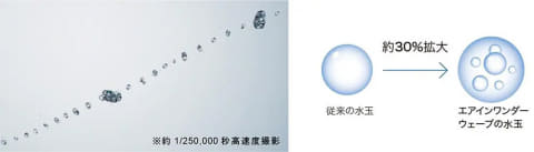 例えば、TOTOが2017年から採用している「エアインワンダーウェーブ洗浄」では1秒間に約100個の水玉を連射。洗浄水のスピードを周期的に変化させ、先に出た遅い水に、後から出た速い水がおしり付近で追いつくことで大きな水玉を作り出す。そして水玉には空気を含ませることでさらに粒を大きくし、「水がたっぷり当たっている感覚」を向上させている。また、吐水を水玉にして間引くことで、同時に節水も叶えているのだ。
