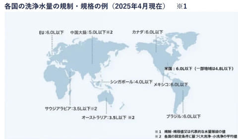 2Lペットボトル約8本分の削減と考えれば、いかに節水が進んだかわかりやすいだろう。節水化の背景には、世界的に洗浄水量が規制・規格化されていることも関係している。