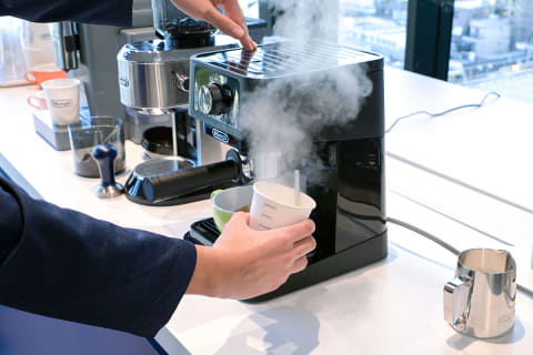 さあ、マシン選びやカフェラテ作りの知識と準備は整いました。ここからは、実際にカフェラテ作りに挑戦してみましょう。今回はデロンギのショールームにて、「スティローザ」を使って体験させてもらいました。
