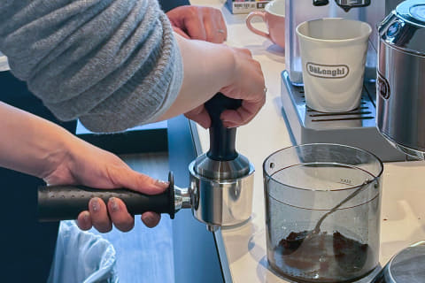 そのため、エスプレッソ用の極細挽きのコーヒー粉を使い、ムラなく隙間なくフィルターに粉を詰めるのがポイント。そして、水平にまっすぐタンピング(コーヒー粉を押し固める作業)すること。これによって、クレマのある美味しいエスプレッソが作れます。