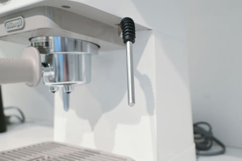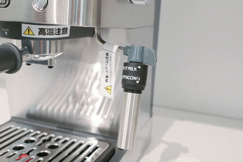 スチームノズルの形状も大事なポイント。ステンレス素材で細いノズルは、空気の入る量を細かく調整できます。そのため、ラテアート向きのきめ細かく滑らかなフォームミルクが作りやすいのが特徴です。一方で、うまく泡立てるには、少しコツと慣れが必要になります。